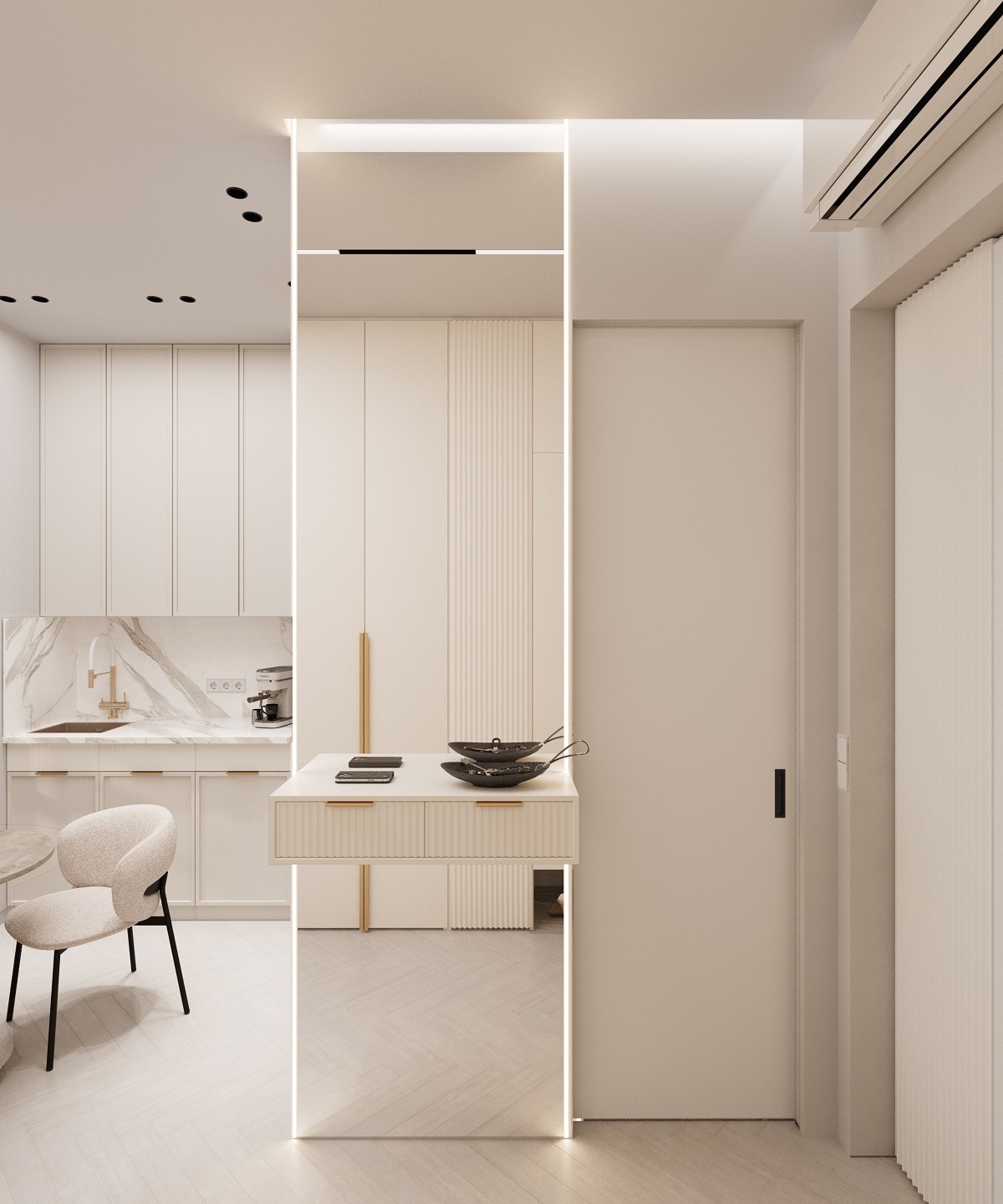 Интерьер в ЖК Will Tower — воплощение легкости и современной элегантности. Обилие белого цвета делает пространство светлым и воздушным, а панорамные окна в пол наполняют его естественным светом в течение всего дня. Натуральные фактуры дополняют атмосферу уюта: на полу — кварцевый паркет в оттенке "Дуб Песочный", который идеально сочетается с благородным мрамором, украшающим отдельные элементы интерьера.
