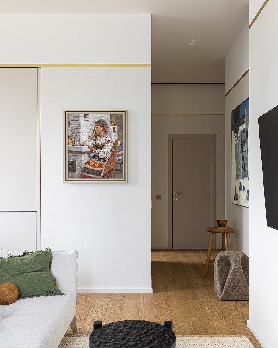 Передо дизайнером Анной Исуповой встала задача найти компромисс между архитектурой современного ЖК, ритмами большого города и привычкой заказчиков жить за городом неспешной и размеренной жизнью, их любовью к малой родине. Поэтому основа проекта стала лаконичной и современной подстать локации и видам из окон. И в эту канву умело вплели историю о любви к природе, традициям, искусству, семейные ценности и рассказы о путешествиях.